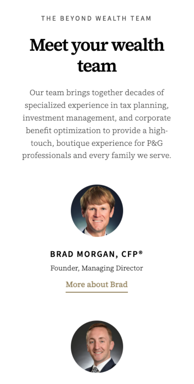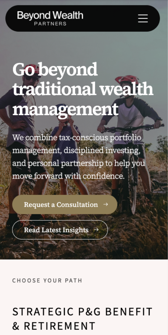 Brad needed a website that declared — clearly and confidently — who Beyond Wealth Partners is, who they serve, and why they're the obvious choice for Procter & Gamble employees navigating retirement. Beyond resolving the brand confusion, the site needed to reflect Brad's personality, showcase his team's credentials, support newsletter growth, and be built to scale as the firm grows.