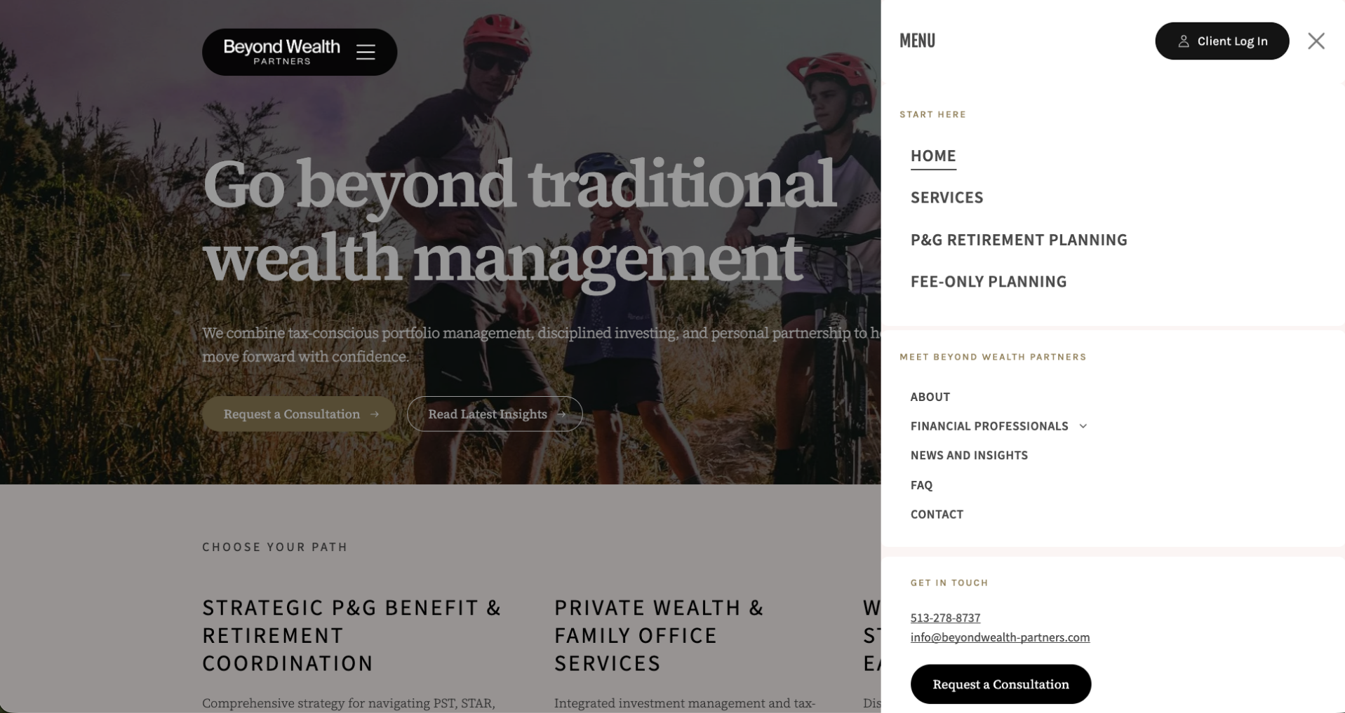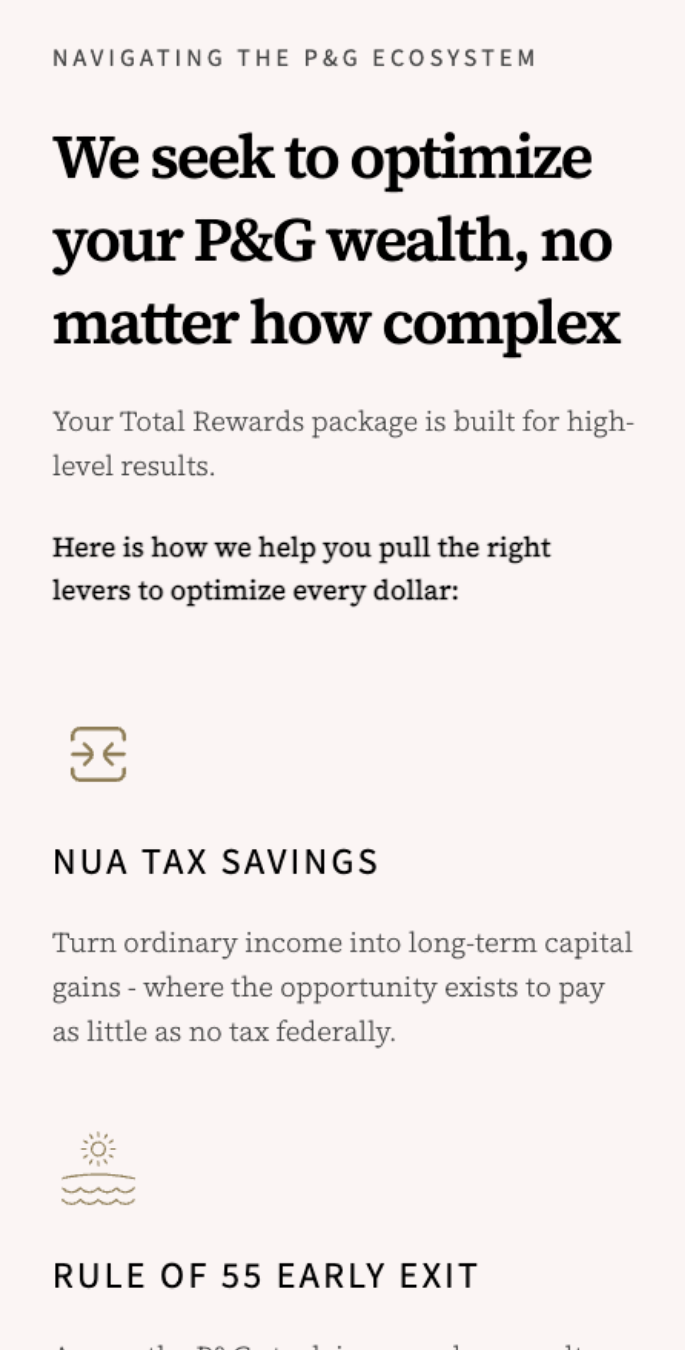 Launch a bold, niche-first website that establishes Beyond Wealth Partners as the go-to retirement planner for Procter & Gamble employees — and makes their independence unmistakably clear.