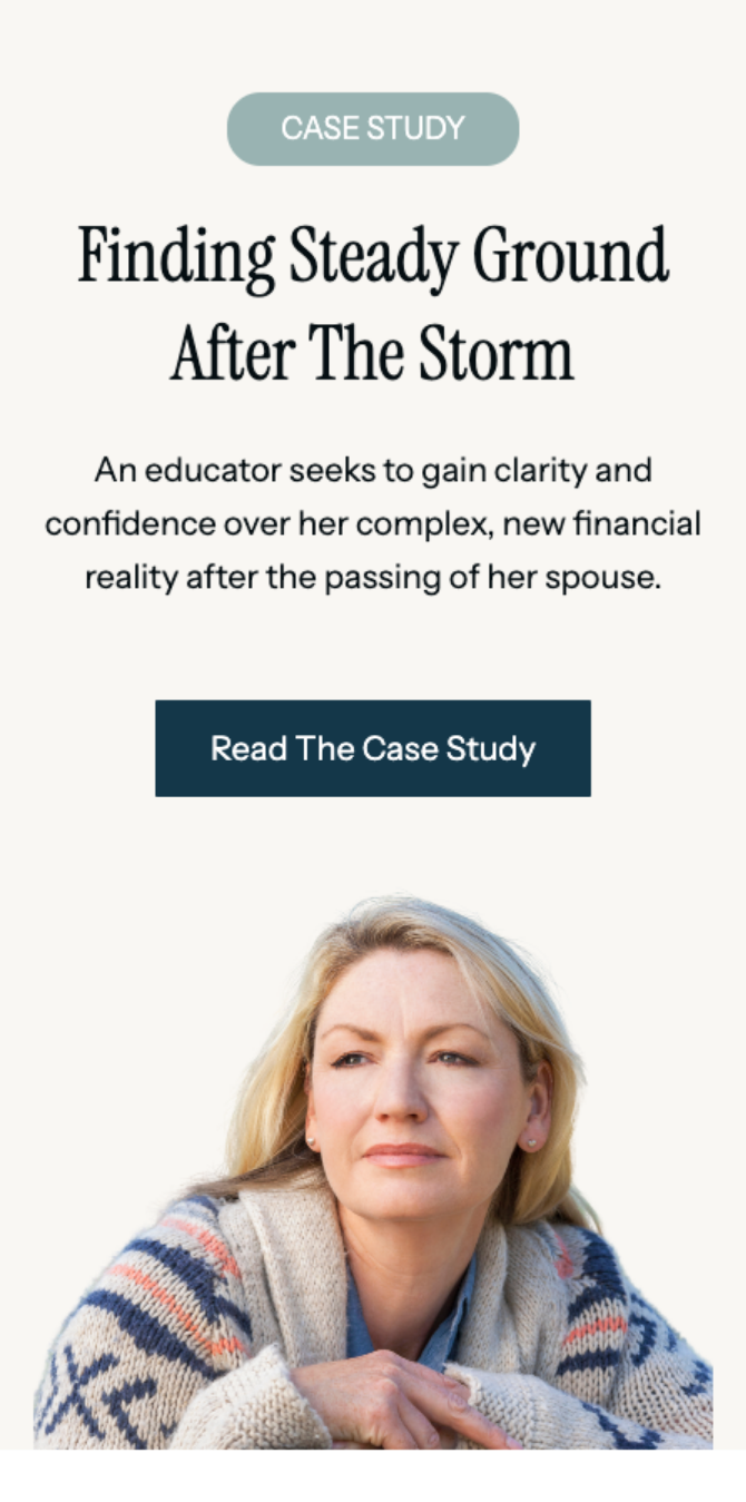 Clients navigating retirement, divorce, the loss of a spouse, or sudden inherited wealth — moments when clarity matters most