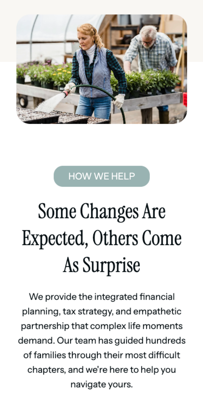 With the wireframes as a guide, we produced the full site copy: homepage, calls to action, four audience-specific service pages, advisor bios, and five original client case studies — one for each key demographic. Each case study was written to accompany its corresponding service page, so prospects could see themselves not just described, but served.