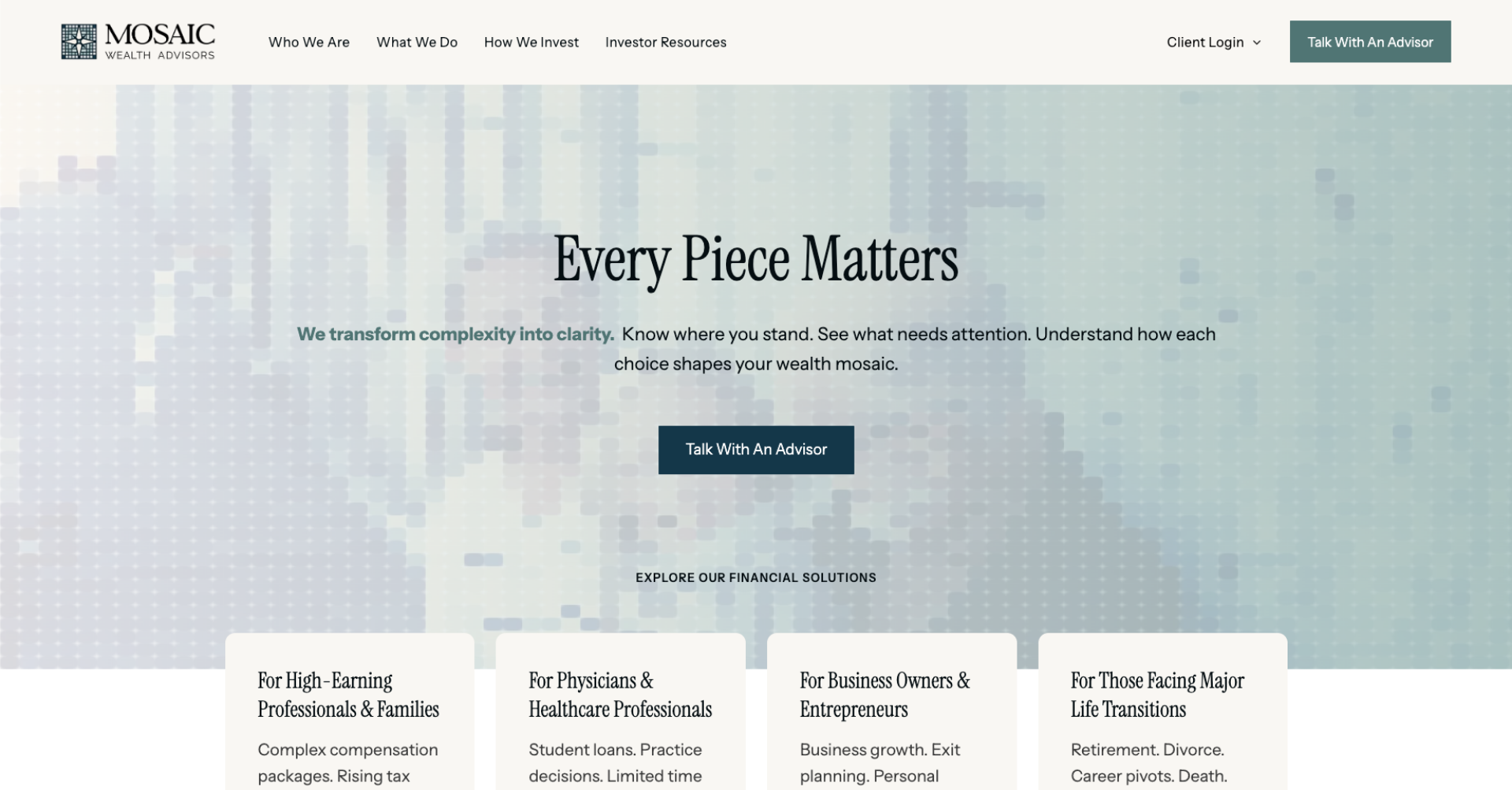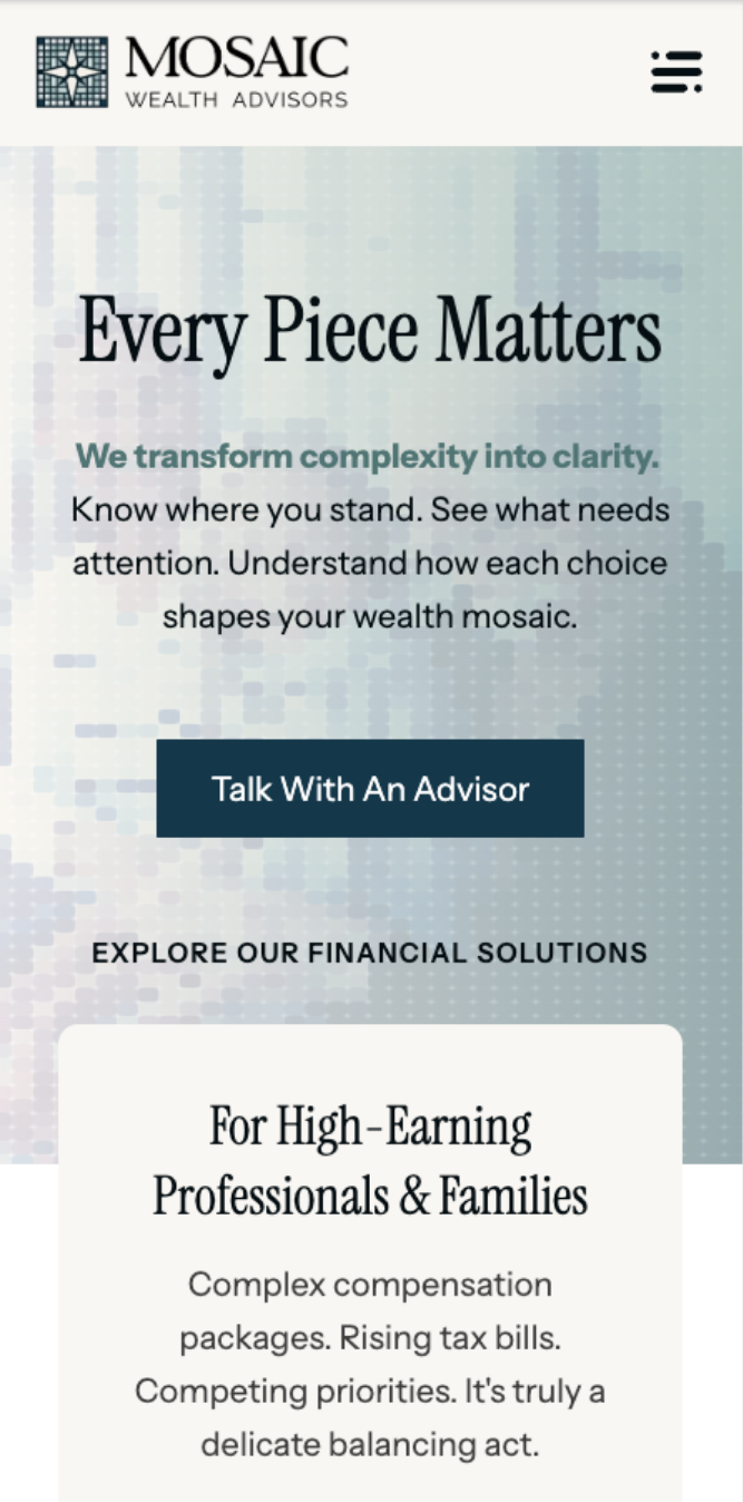 The site launched on time — a complete brand presence, built in six weeks, ready the moment Mosaic Wealth Advisors stepped out from under their prior firm. Current clients had somewhere to go, something credible to look at, and a clear signal that the team they trusted hadn't just moved — they'd upgraded.