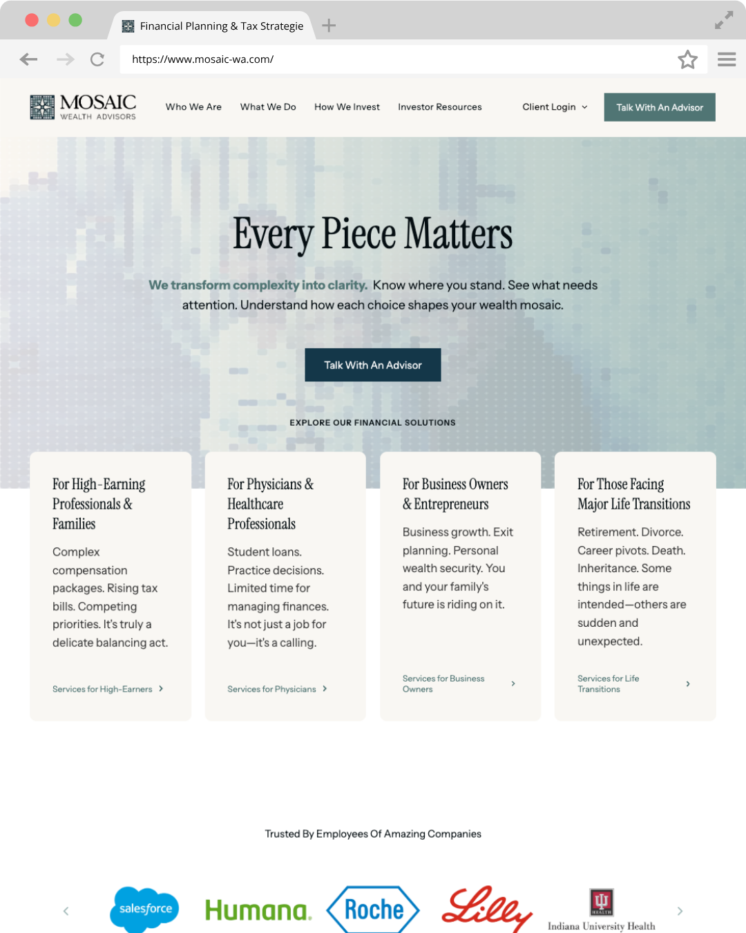 You built your wealth management firm on expertise, trust, and relationships. But your website was built by a generalist agency — or worse, a template. It doesn't reflect who you are, who you serve, or why you're different. And your prospects notice.